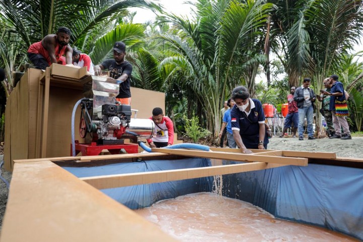 “Awalnya kami masih mengolah sagu dengan cara tradisional, dan kami hanya bisa memproduksi 5 sampai 6 kantong per pohon sagu. Berat satu kantong 30 kilogram. Namun dengan menggunakan mesin ini, kami mampu memproduksi 20-25 kantong. dari 30kg sagu,” kata Vitha.
