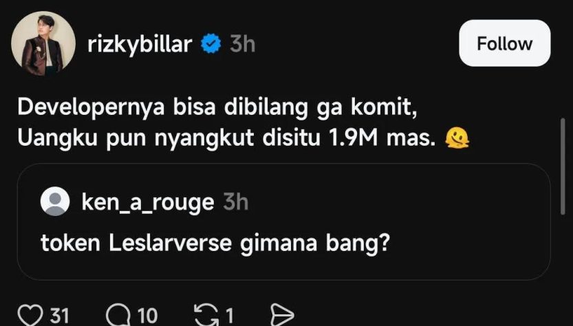 Melalui unggahan di platform Threads pada Kamis, 16 April 2026, Billar membongkar borok di balik layar proyek kripto yang sempat viral tersebut. Tak tanggung-tanggung, suami Lesti Kejora ini mengaku harus kehilangan dana hingga miliaran rupiah.